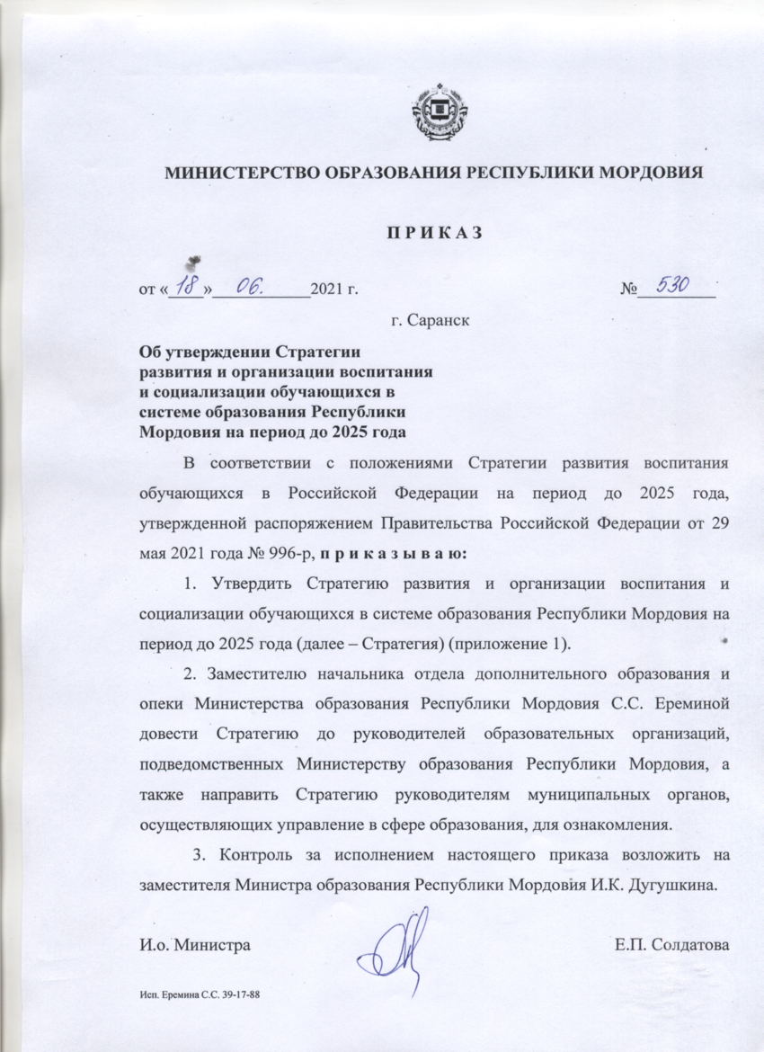 Приказ об утверждении Стратегии развития и организации воспитания и социализации обучающихся в системе образования Республики Мордовия на период до 2025 года (Приказ об утверждении Стратегии)